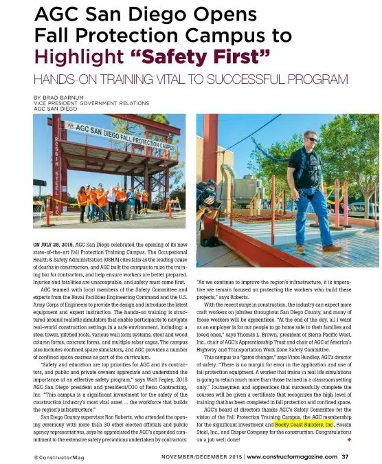 RCB furthers our commitment to both Safety and our future craft workers by helping to build the first of its kind, state-of-the-art Fall Protection Training Campus here in San Diego. Many of our own valued employees have received training or are currently enrolled in the Apprenticeship program and will without doubt benefit from this new facility. We are proud to be part of the team helping to advance our Apprenticeship program.
